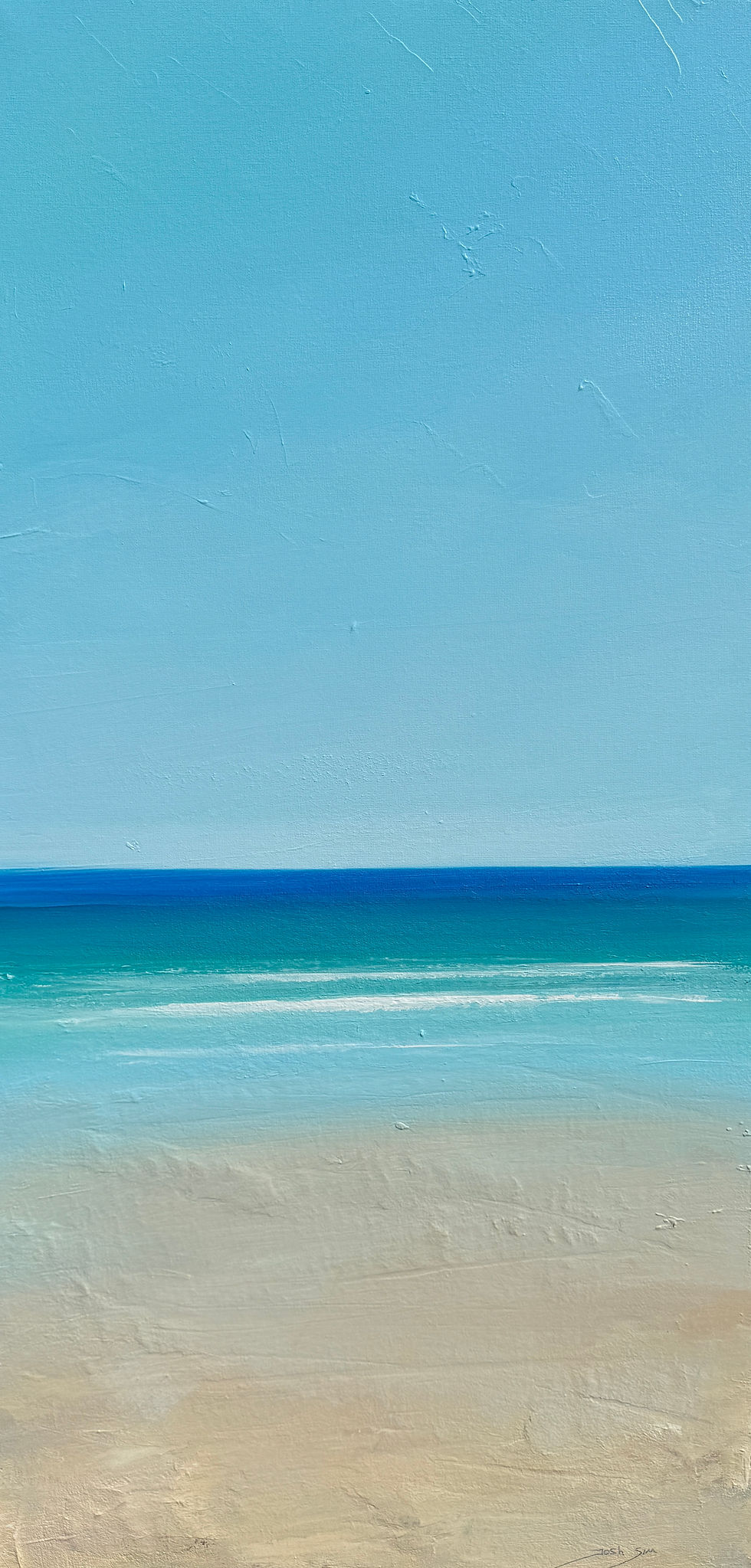 A serene coastal scene unfolds in soft gradients of turquoise and sand, where the horizon line quietly divides sky and sea. Gentle brush textures evoke the rhythmic calm of shallow waves meeting the shore, while the minimalist composition invites stillness and reflection. The piece captures a fleeting moment of peace—where time seems suspended and the vast openness of the ocean soothes the senses.